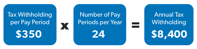 Get out your last paystub again and see how much your employer withheld for your federal income tax. Let’s say your employer takes out $350 each paycheck and you get paid twice a month. That means your employer is sending $8,400 to the IRS in taxes each year. Now you have to figure out if that’s too much or not enough.